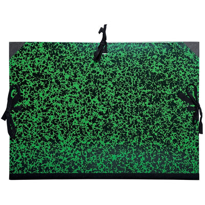 Verschluss mit 3 Paar Bändern. Ecken und Rücken aus schwarzem Leinen. Grün/schwarz marmoriert. FSC-zertifiziert.