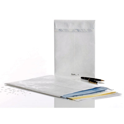Nahezu verschleißfest, keine Riss- oder Perforationsgefahr. Vollständiger Schutz schwerer oder großer Dokumente. Völlig wasserdicht. 55 g/m². Mit Streifenverschluss. Farbe: weiß.