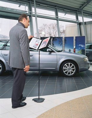 Both the telescopic rod and the base are made of scratch-resistant plastic, which improves the durability and lifespan of the product. This floor stand is suitable for presenting up to 20 A4