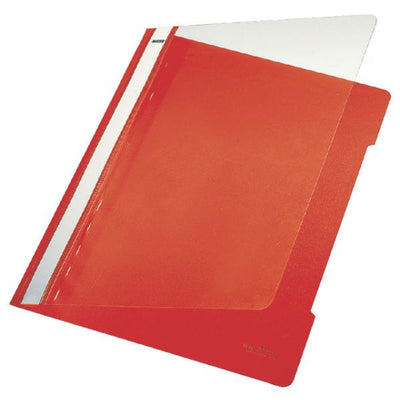 - Leitz standard plastic red quotation folder, 30% pre-consumer recycled plastic. Top quality folders made from 30% pre-consumer recycled plastic for better protection of the contents. *Made from 30% pre-consumer recycled PP plastic. *100% recyclable (metal mechanism must be separated from the plastic). *High-quality materials ensure a long-lasting product and help conserve the earth's resources. *Crystal clear cover shows first page of document. *Full-length title strip, with cutouts at top and bottom for easy removal. *Cutout at the back for easy opening. *Capacity 60 x A4 (80 gram paper). *Label only - no further packaging waste.
