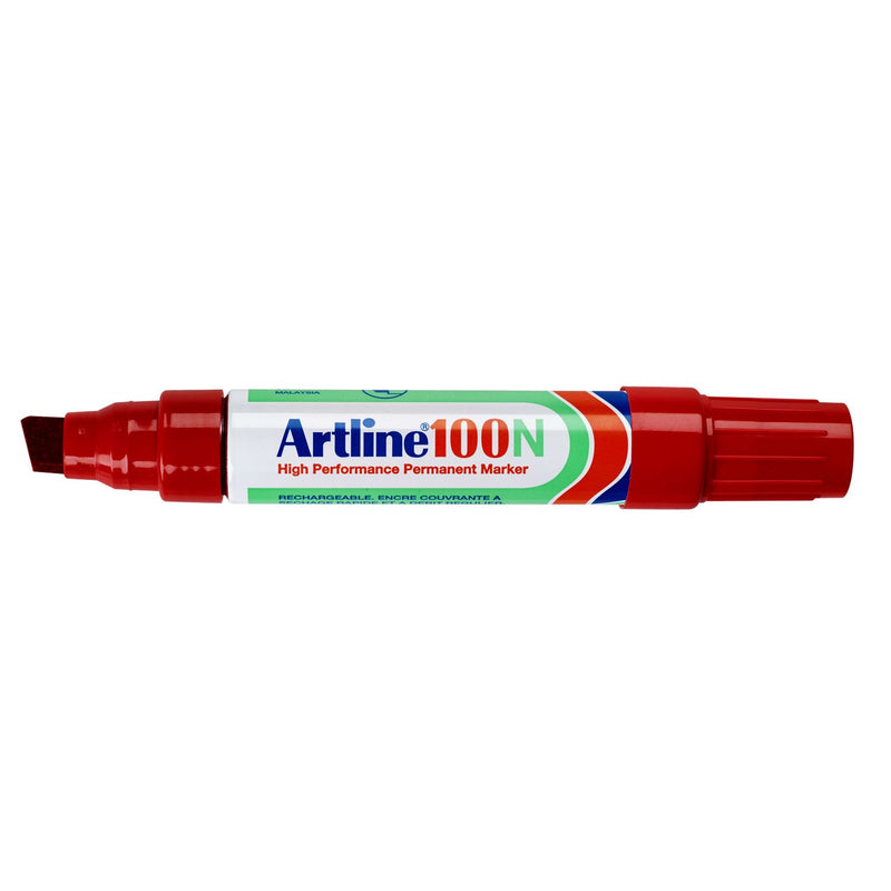 - El marcador permanente Artline 100 rojo tiene una punta de cincel en ángulo con un ancho de escritura de 7,5-12 mm.