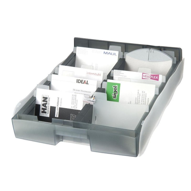 Capacidad: 2.000 tarjetas de visita. Cuando se abre, la tapa se desliza debajo de la bandeja de patatas fritas. Posibilidad de personalizar la tapa. Se suministra con 8 índices móviles y un índice alfabético (16 piezas). Pies 21,5 x 30 x 6,8 cm. Color: gris transparente.