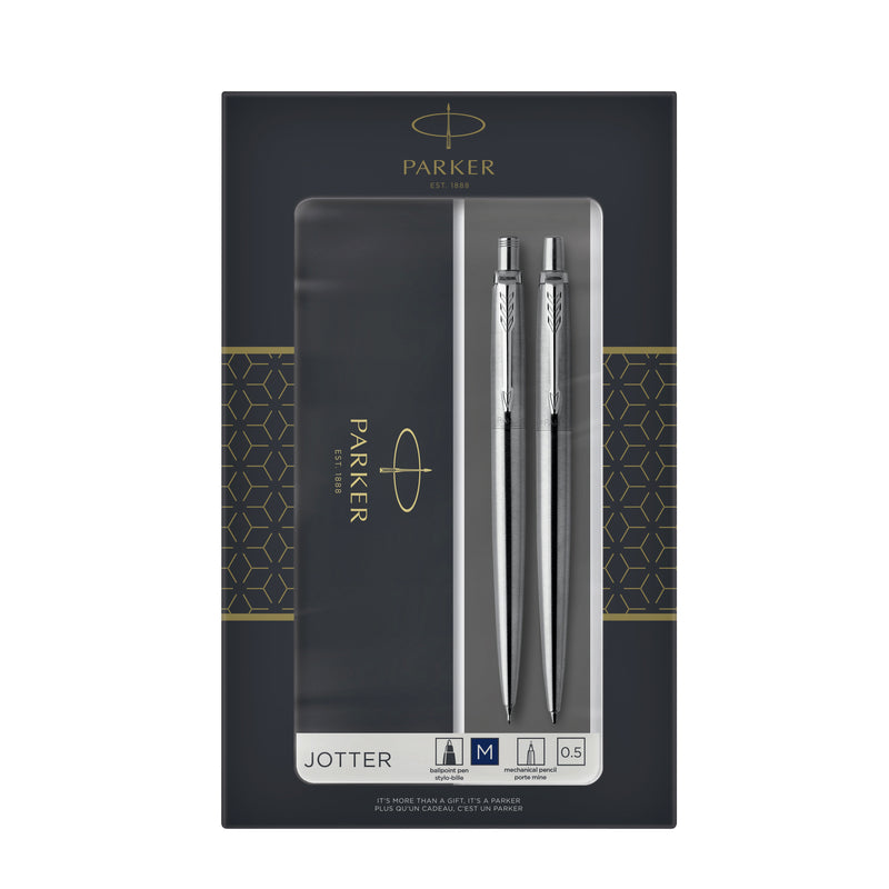 - Juego dúo de bolígrafo y portaminas Parker Jotter de acero inoxidable.