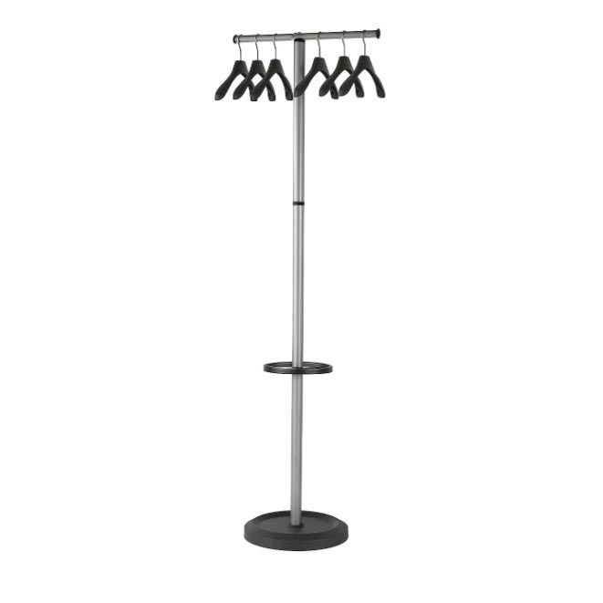 Perchero vertical Fabricado en acero de alta calidad, acabado con pintura en polvo plateada Con paragüero Incluye 6 perchas negras Ft 50 x 35,5 x 173 cm Color: negro