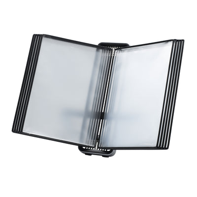 Este producto es ideal para autónomos, trabajadores a domicilio y oficinas pequeñas que necesitan un lugar de trabajo organizado y eficiente. El sistema contiene 10 paneles de visualización con bisagras de PP negro A4, perfectos para presentar documentos con claridad. un escritorio