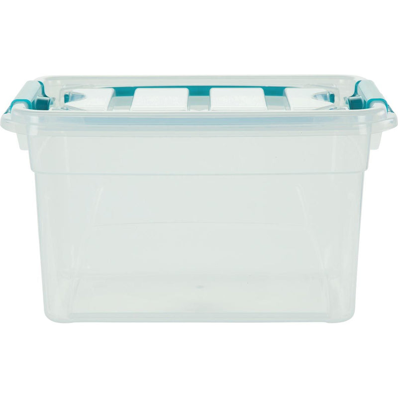 Caja de almacenamiento fabricada en plástico resistente y transparente, 100% libre de BPA (Bisfenol A). La tapa se puede cerrar con 2 clips azules, protegiendo el contenido del polvo y la suciedad. Perfectamente apilable con o sin tapa. Con asas planas en la parte superior de la tapa. Ideal para guardar accesorios de escritorio, etc.
