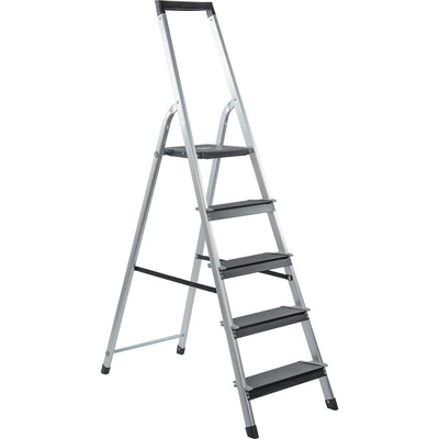 Escabeau en aluminium avec marches larges Plateforme antidérapante avec verrouillage automatique Marches recouvertes de noir et doublement graissées Avec porte-outils pratique Profilés traités avec couche anti-salissures Marches antidérapantes extra larges en aluminium : 12 cm