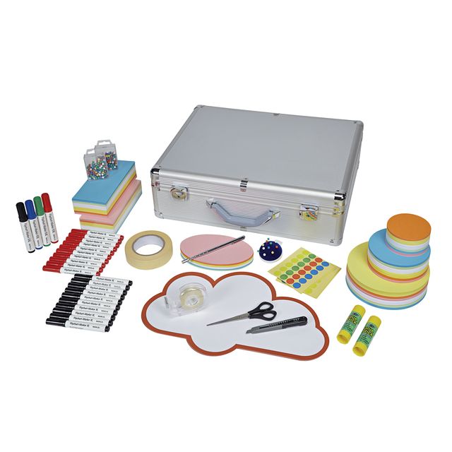 Grand coffret en aluminium de haute qualité contenant plus de 2782 pièces. Apparence représentative avec optique rainurée argentée. L'intérieur préformé assure l'ordre et peut être verrouillé avec deux verrous pliables stables. Idéal pour les présentations et les ateliers avec poignée ergonomique, picots en mousse et sangle pour sécuriser les pièces. Comprend des marqueurs, des ciseaux, un cutter, un poussoir
