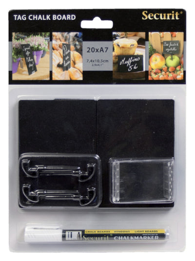 - Tableau A7. *Peut être utilisé des deux côtés. *Pour un meilleur résultat d'écriture, utilisez les marqueurs à craie Securit. *Le tableau est facile à nettoyer avec un chiffon humide. *Les tableaux universels sont fournis sous forme de jeu par taille. *L'ensemble comprend 20 panneaux, 4 porte-épingles, 2 supports de table et un marqueur à craie blanche.