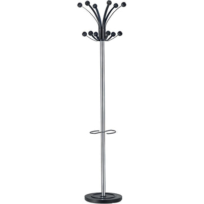 La partie supérieure du portemanteau peut pivoter. Avec 12 patères rondes avec une couche antidérapante, pour que les manteaux et les vêtements ne tombent pas. Comprend un porte-parapluie en bas. Hauteur : 175 cm. Fabriqué en acier chromé et en plastique. Base robuste d'un diamètre de 34 cm. Couleur : gris chromé.