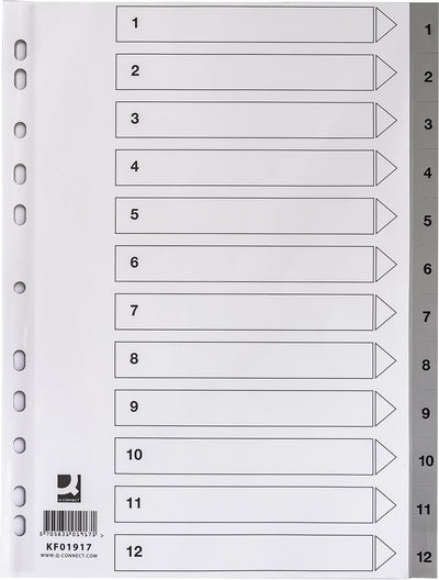 Q-CONNECT - inserti a rubrica, A4, PP, perforazione a 11 fori, con indice, set da 1-12, grigio