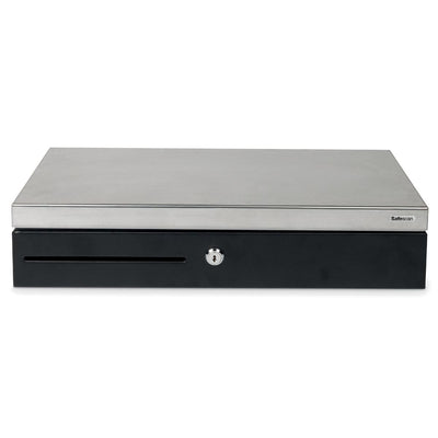 Alloggiamento in metallo robusto e sicuro Testato per essere aperto almeno 1 milione di volte Con coperchio in metallo Apertura elettrica e con chiave Scomparto regolabile e rimovibile per 8 valute Contiene 6 scomparti per banconote regolabili Fessura per la conservazione di banconote e oggetti di valore di alto valore Compatibile con stampanti di ricevute RJ12 e sistemi di registratore di cassa (12 V/24 V) Blocco a 2 posizioni (chiuso, standby e aperto) Scatola di inserimento extra opzionale e coperchio con serratura Ft 46 cm x 17 cm x 10 cm (l x p x a) Peso: 4,3 kg Voltaggio: 12 V/24 V Certificato CE Garanzia: 1 anno