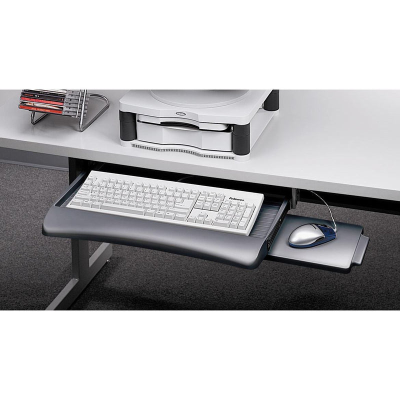 Plaatst het toetsenbord op een ergonomisch correcte hoogte. Kan op 3 hoogtes worden aangepast. Inclusief glijdende muislade, die kan worden geïnstalleerd voor gebruik met linker- of rechterhand. Kleur: grafiet.