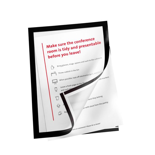 Met een formaat van A4 en een stijlvolle zwarte kleur, past het frame in elke professionele omgeving. Verpakt per 2 stuks, biedt het de mogelijkheid om meerdere plekken van duidelijke communicatie te voorzien. Of u nu belangrijke informatie wilt delen in een kantooromgeving of een aantrekkelijke presentatie wilt creëren in een winkel, dit product biedt de flexibiliteit en het gebruiksgemak dat u zoekt.