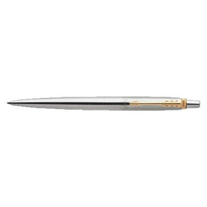 *De Parker Jotter Stainless steel balpen heeft een vakkundig vervaardigde rvs body, gecomplementeerd met een vergulde pijlpuntclip.