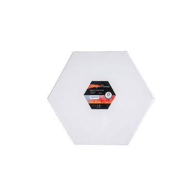 - en acrylverf. Het doek is in de vorm van een hexagon en heeft een afmeting van 30 cm doorsnede.