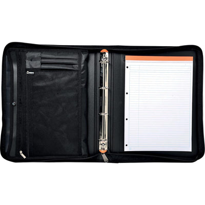 Uit stevige PP. Voorzien van plaats voor notablok ft A4 of schrift, visitekaarten, pennenhoes en vakken voor het klasseren van losse documenten. Met 4 ringen. Met handvat en volledige ritssluiting. Met verstevigd vak voor tablet. Kleur: zwart. Ft 27 x 36 cm.