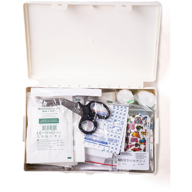 Inhoud: - 10 x kinderpleister ft 10 x 6 cm - 1 x wondsnelverband ft 6 x 8 cm - 1 x snelverband gerold ft 6 x 8 cm - 6 x niet verklevend kompres ft 7,5 x 7,5 cm - 2 x gaaskompres 1/16 - 2 x gaaskompres ft 5 x 5 cm - 1 x tekentang - 1 x splinterpincet - 1 x verbandschaar 14 cm - 1 x elastisch hydrofiel windsel 4 cm - 1 x elastisch hydrofiel windsel 6 cm - 1 x instant cold pack - 1 x assortiment kinderpleisters, 20 stuks - 1 x desinfectant 30 ml - 1 x universeel windsel 6 cm - 1 x wondpleisterft 100 x 6 cm - 1 x set wegwerphandschoenen, 2 stuks - 1 x zelfhechtend windsel 6 cm - 1 x hechtpleister ft 500 x 2,5 cm - 1 x mondkapje voor beademing - 1 x reddingsdeken - 1 x set hechtstrips, 10 stuks - 1 x stroomdiagram - 3 x brandwondensachet3,5 ml