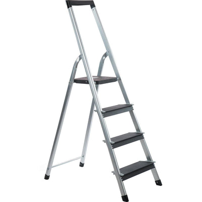Aluminium trapladder met brede treden Antislipplatform met automatische vergrendeling Treden zwart gecoat en dubbel gerevetteerd Met handige gereedschapshouder Profielen behandeld met vuilafstotende laag Extra brede antisliptreden in aluminium: 12 cm