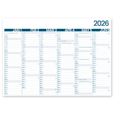 Groot Memento kalender met 6-maandoverzicht. Formaat.430x320 mm. 6 maanden per zijde met Belgische Feestdagen. Tweetalig en voorzien van schrijfruimte. Hard karton met een dikte van 1mm.