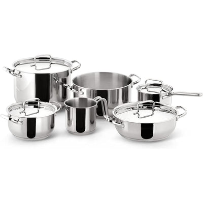Uit roestvrij staal Vaatwasserbestendig Geschikt voor alle kookplaattypes 10-delige set: - 1 x hoge kookpan, 22 cm - 1 x kookpan, 18 cm - 1 x kookpan, 22 cm - 1 x hapjespan, 24 cm - 1 x steelpan, 14 cm - 1 x melkpot, 12 cm - 4 x deksel, 14/18/22/24 cm