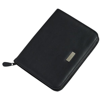 De buitenzijde van de map is voorzien van een metalen plaatje, waarop een tekst of logo middels lasergravure kan worden aangebracht. Dit maakt de schrijfmap niet alleen functioneel, maar ook een persoonlijk en professioneel accessoire. De map is uitgevoerd in een klassieke zwarte kleur, waardoor hij geschikt is voor elke zakelijke omgeving.